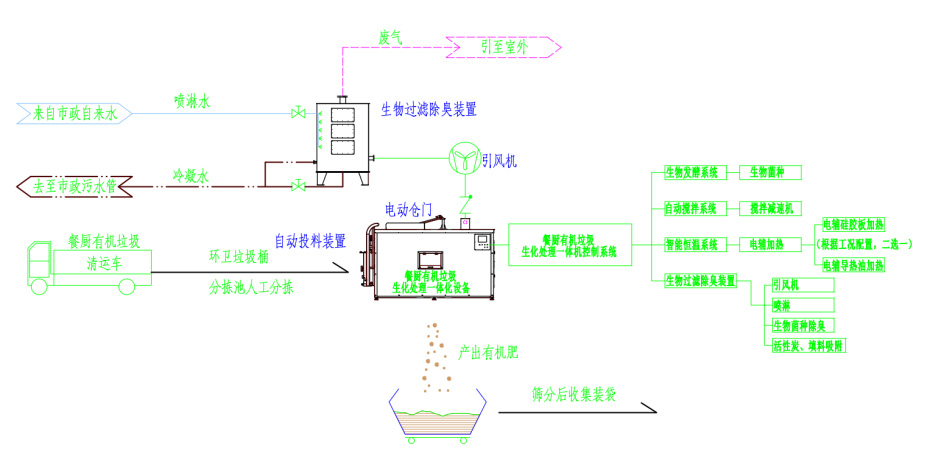 餐厨有机垃圾生化处理一体机集成了:自动投料装置、电动仓门、自动搅拌装置、智能恒温系统、生物过滤除臭装置、微生物发酵系统。实现了模块化安装维护的设计要求。